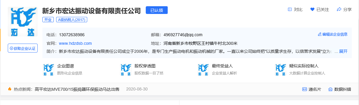 恭喜新鄉市宏達振動設備有限責任公司獲得了“中級企業名片”認證